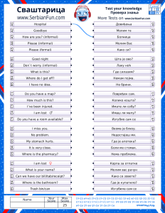 Test your Serbian vocabulary of words and phrases in Serbian Latin Alphabet or Serbian Cyrillic (Ћирилица). Download and print our FREE pdf tests below.